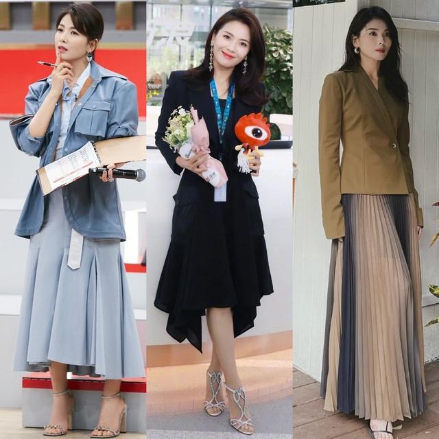 懂得玩转混搭风的女人,都是很有气质的,就好比常见的西装,有的人只知道配西装裤,但刘涛却偏爱不规则长裙,腰粗采用捏褶设计的缎面连衣裙,贵气感十足,侧边开叉剪裁的不规则百褶裙,尽显时尚感。