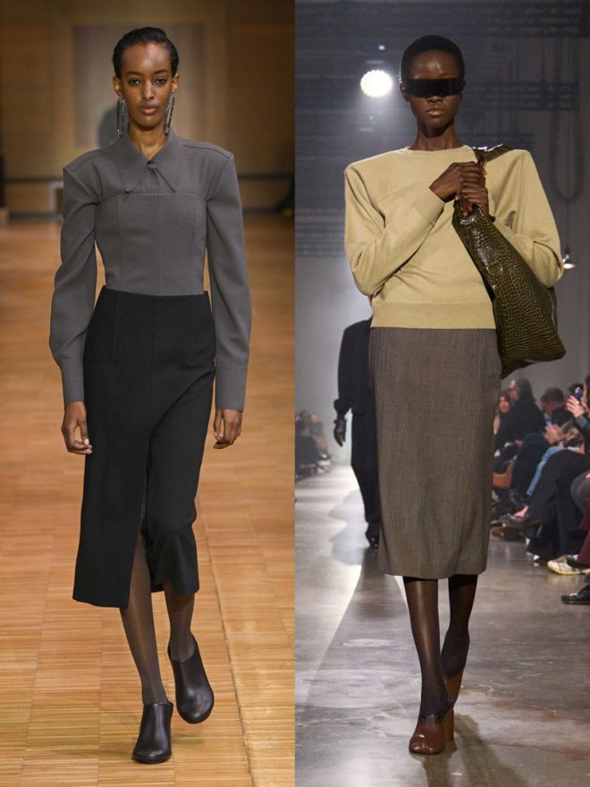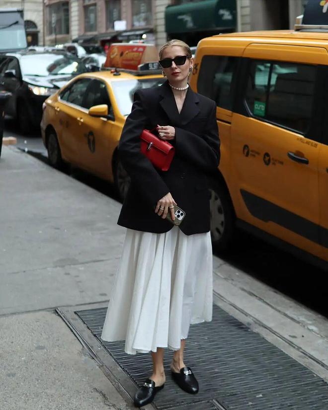 再配上半身裙,它不像连衣裙那样挑身材,也不像裤子那样显得死板,裙摆轻轻晃着,既有女人味,又不会拖拖沓沓,不管是梨形身材、苹果形身材的女性,穿对了都能藏住小缺点,显出身形的利落感。