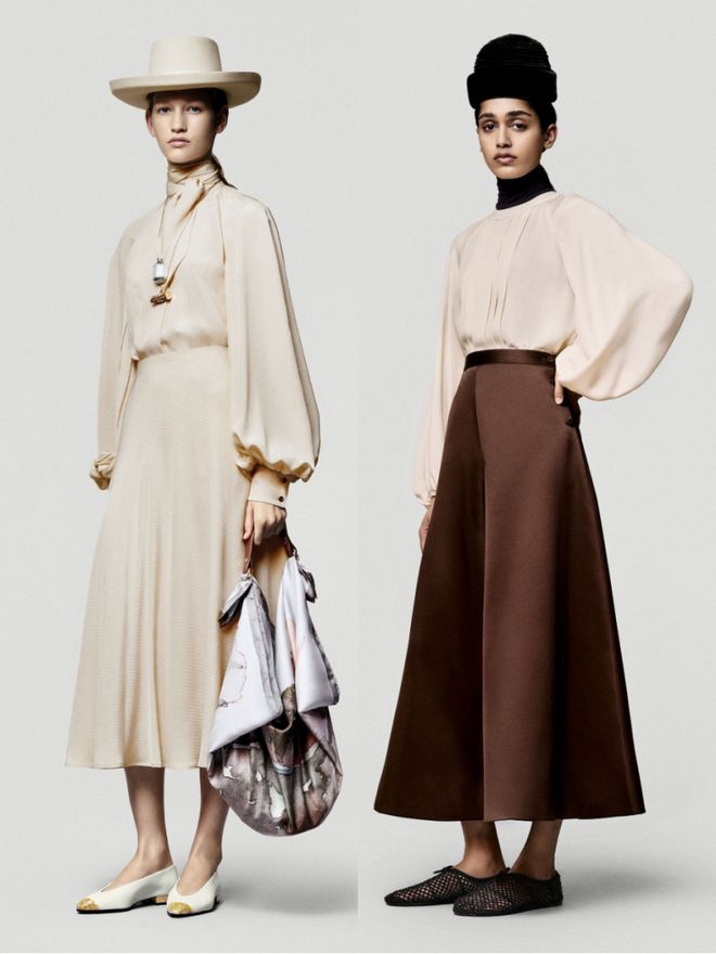 浅米色缎面衬衫+同色系半身裙,材质柔和有光泽,搭配白色平底鞋与宽檐帽,色彩淡雅、线条舒展,像法式优雅电影里的造型,体现出优雅大方的“大女主”性格,也非常适合约会、下午茶这类温柔氛围的场合。如果觉得整体颜色过于单调,可以胸前搭配胸针或项链,提高整体视觉效果。