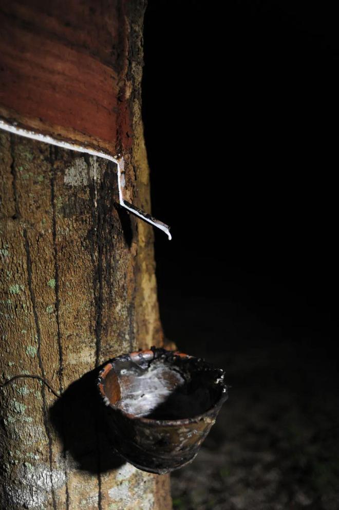 一棵树收集完大约需要15分钟,然后胶农们会赶在8点前,将所有的乳胶割完,并且送到工厂投入生产。