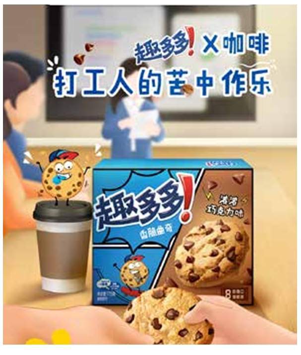 说完奥利奥云朵蛋糕,我们再来看看亿滋旗下的另一个曲奇饼干品牌趣多多。趣多多的核心场景叫作“午后职场焕活”,针对打工人的下午茶需求做文章。
