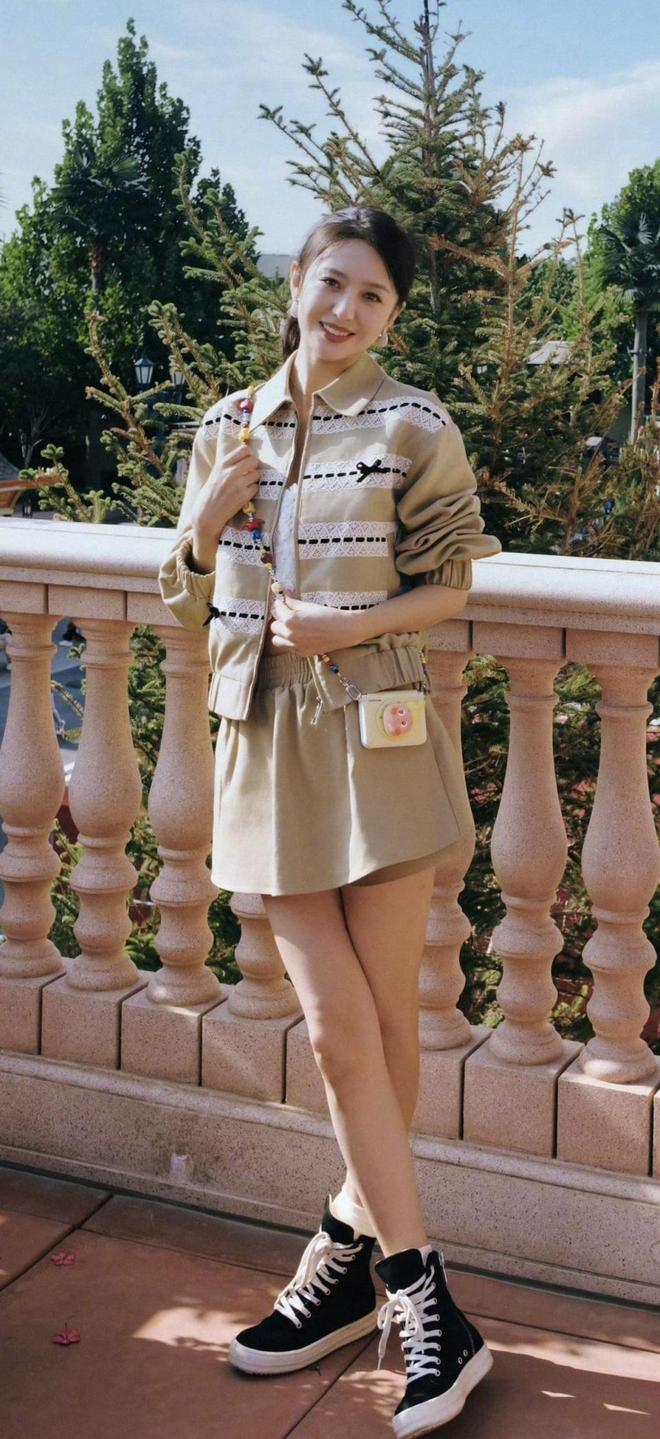 佟丽娅站在栏杆旁,腰间还挂着一个可爱的小包包。整体造型既保留了卡其色的温柔,又因为彩色可爱小包包的加入,多了几分活泼与俏皮。她的双腿交叉站立,姿态优雅,身后的绿树蓝天作为背景,更衬托出她的清新与美丽。