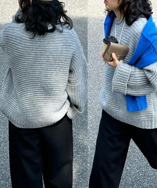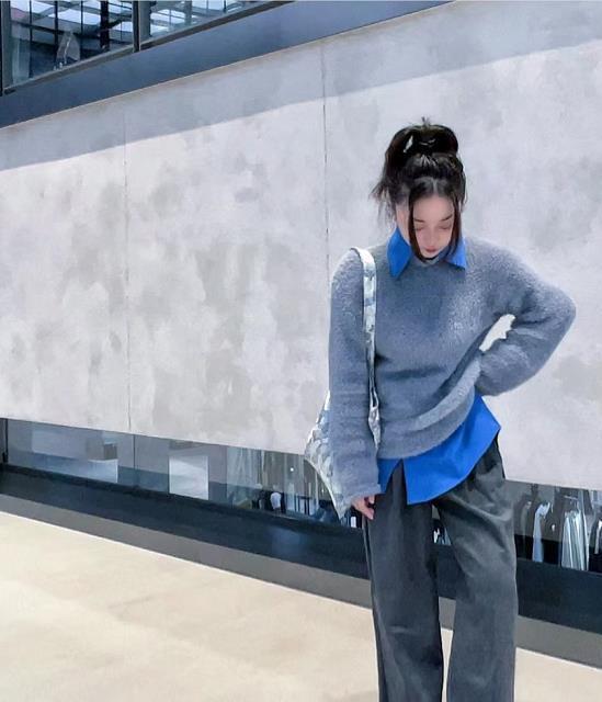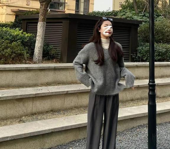 高级灰,真的是没有人会拒绝的吧?简简单单的毛衣,很好搭配衣服,冬天在里面叠穿一件高领打底,很保暖。