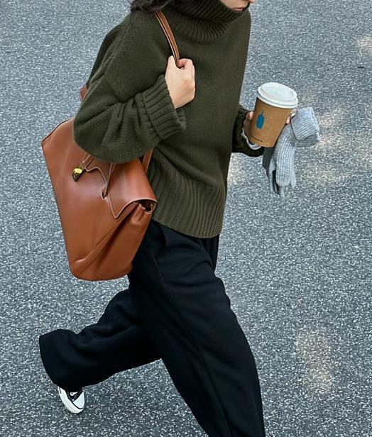 宽松的毛衣+阔腿裤,真的轻松就将身上的肉肉给遮掩起来了,为了显得利落一些,可以把毛衣下摆塞进裤子里。