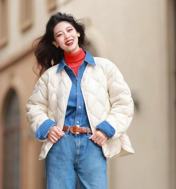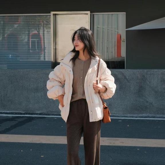 松弛有度的穿搭,才是最符合冬季的着装,完全不冻人的穿搭,奶白色短羽绒服,内搭毛衣+阔腿裤,保暖又好看,裤子和毛衣的颜色,都有些偏美拉德风。