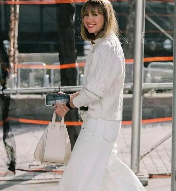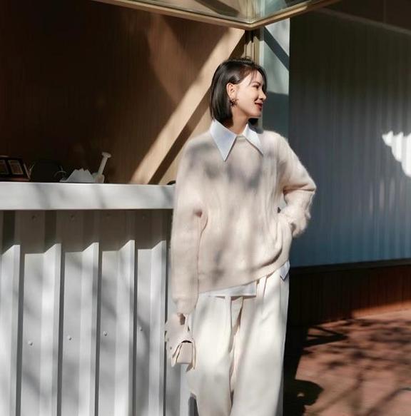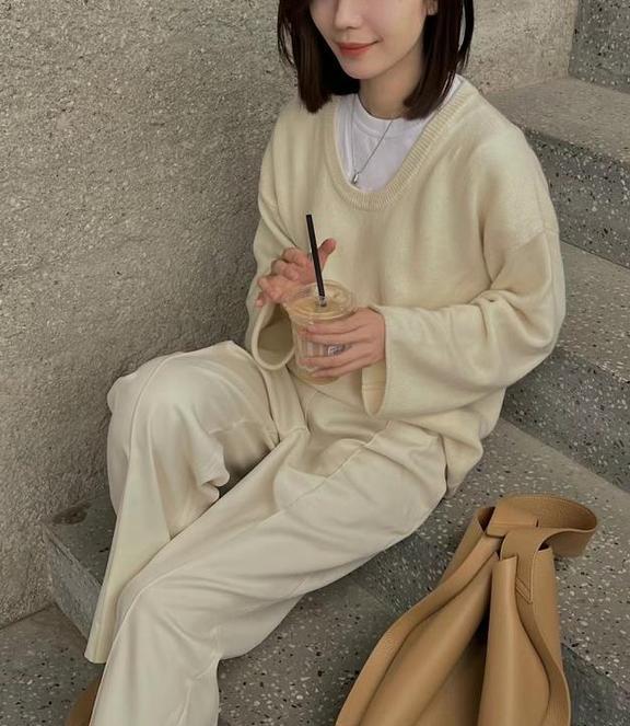 秋冬的穿搭就是要去繁就简,特别是在配色上,干净一些的配色更能穿出时髦高级感。U领大毛衣+阔腿裤,颜色一致,真的很显和谐好看,毛衣和裤子的色调都是奶白色,温柔气质极了。