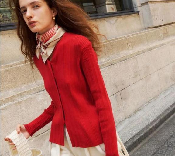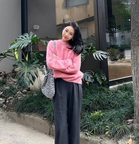 所以,在选择毛衣+阔腿裤时,毛衣不妨尝试下亮色,减龄又洋气,为了平衡亮色带来的高调感,裤子选深色和中性色来中和就行。