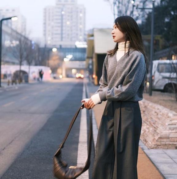 就说有谁可以逃过高级灰的吸引?真的很容易穿出高级和时髦的颜色啊,v领毛衣修饰身材一绝。可以在里面叠穿一件高领打底,轻松营造层次感,搭配起高腰西装阔腿裤,瞬间一米八。