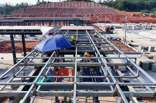 位于新兴县的广湛高铁新兴南站综合交通枢纽工程施工现场,依然机械轰鸣、焊花闪烁